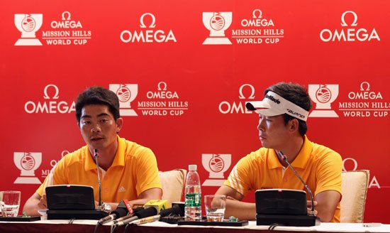 中國隊梁文沖和 張新軍希望能在世界杯中獲得最佳戰績 騰訊體育訊 11月23日,2011 歐米茄 星座系列 和歐米茄手錶觀瀾湖高爾夫世界杯在觀瀾湖海口國際高爾夫度假區舉行瞭盛大的開幕